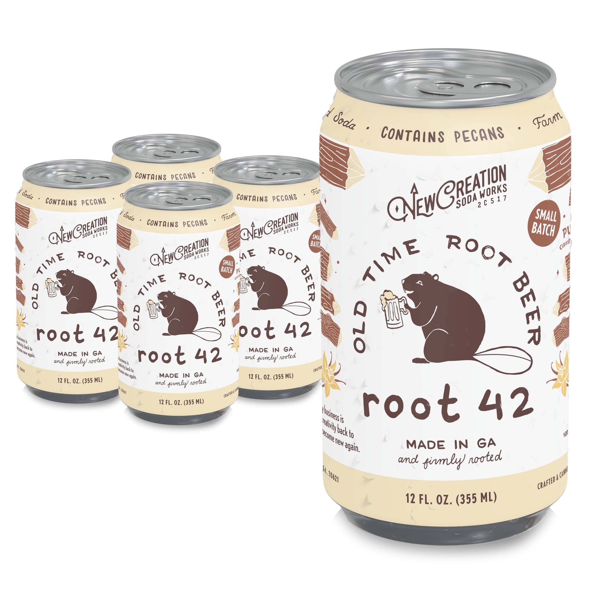 Heavy bodied, creamy and silky with deep caramel and vanilla notes, mellow sassafras flavor and a clean wintergreen finish. There is nothing like the taste of real, old fashioned Root Beer. People are telling us Root 42 is replacing their conventional brand as their favorite root beer. Find out why! We can't keep enough of these bad boys in our retail locations. Ingredients: Purified Water, caramelized pure cane sugar, natural flavors, two-fold vanilla extract, natural pecan flavor, lemon juice,  sodium benzoate (for freshness), natural acidifier; CONTAINS PECANS