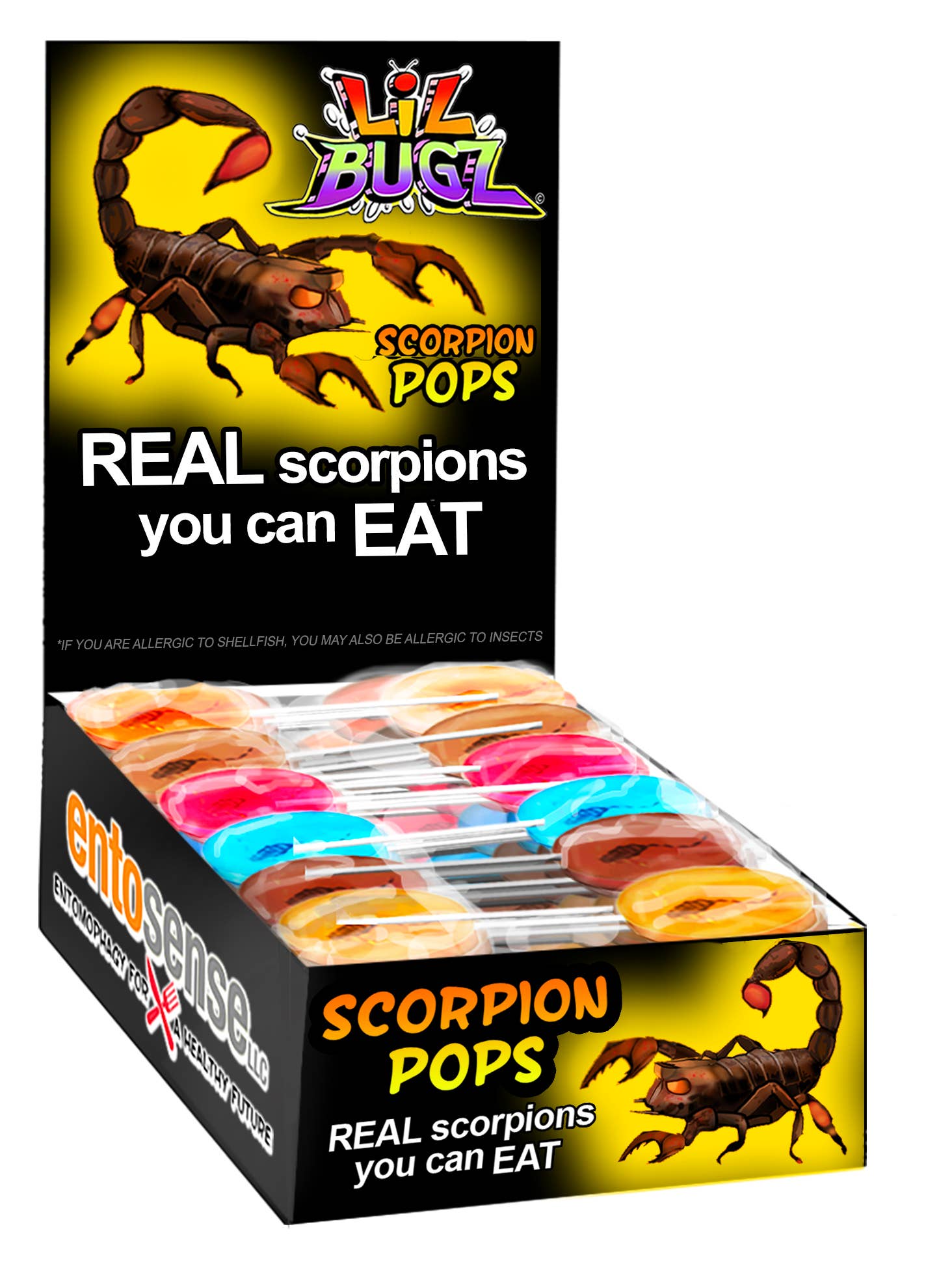 SCORPION POPS Real scorpions you can eat encased in hard candy. Yup, these lollipops have a real scorpion inside, including the pinchers and stinger! Don't worry; the poison in the stinger goes inert shortly after it is killed. There is no danger in eating a scorpion, stinger, and all; once it's been prepared correctly. Scorpions have been around longer than humans, and some scorpions are venomous enough to kill a human (although this is rare). This is your chance to bite back!